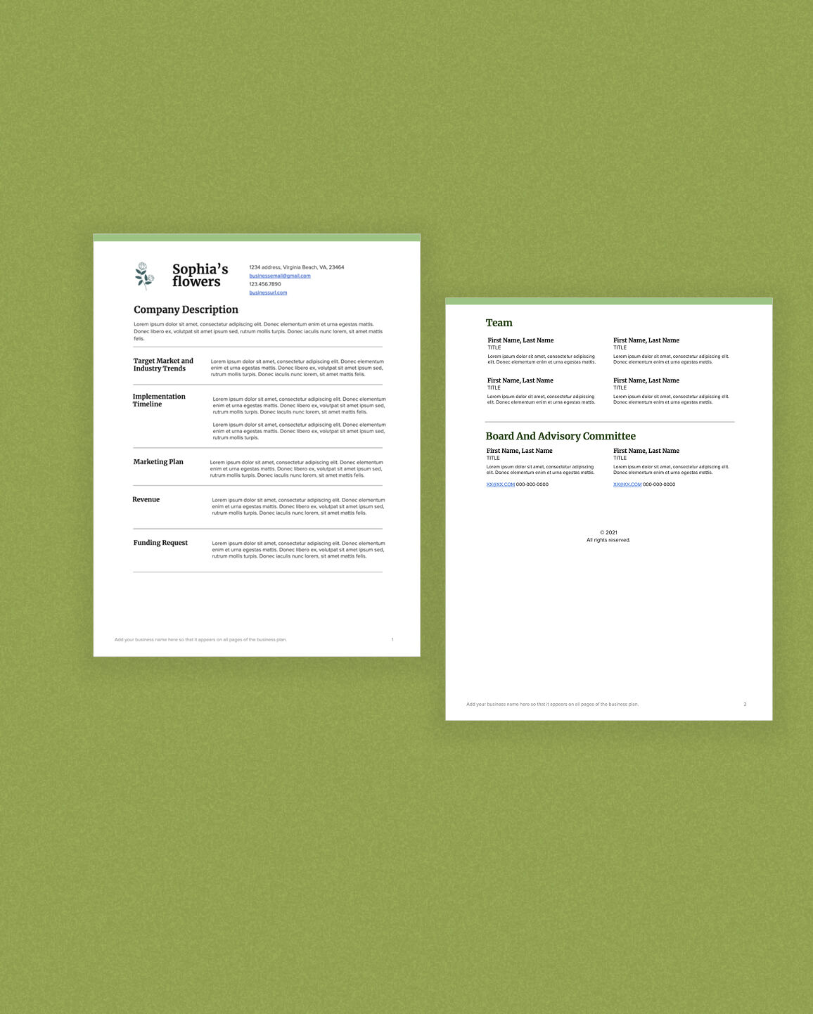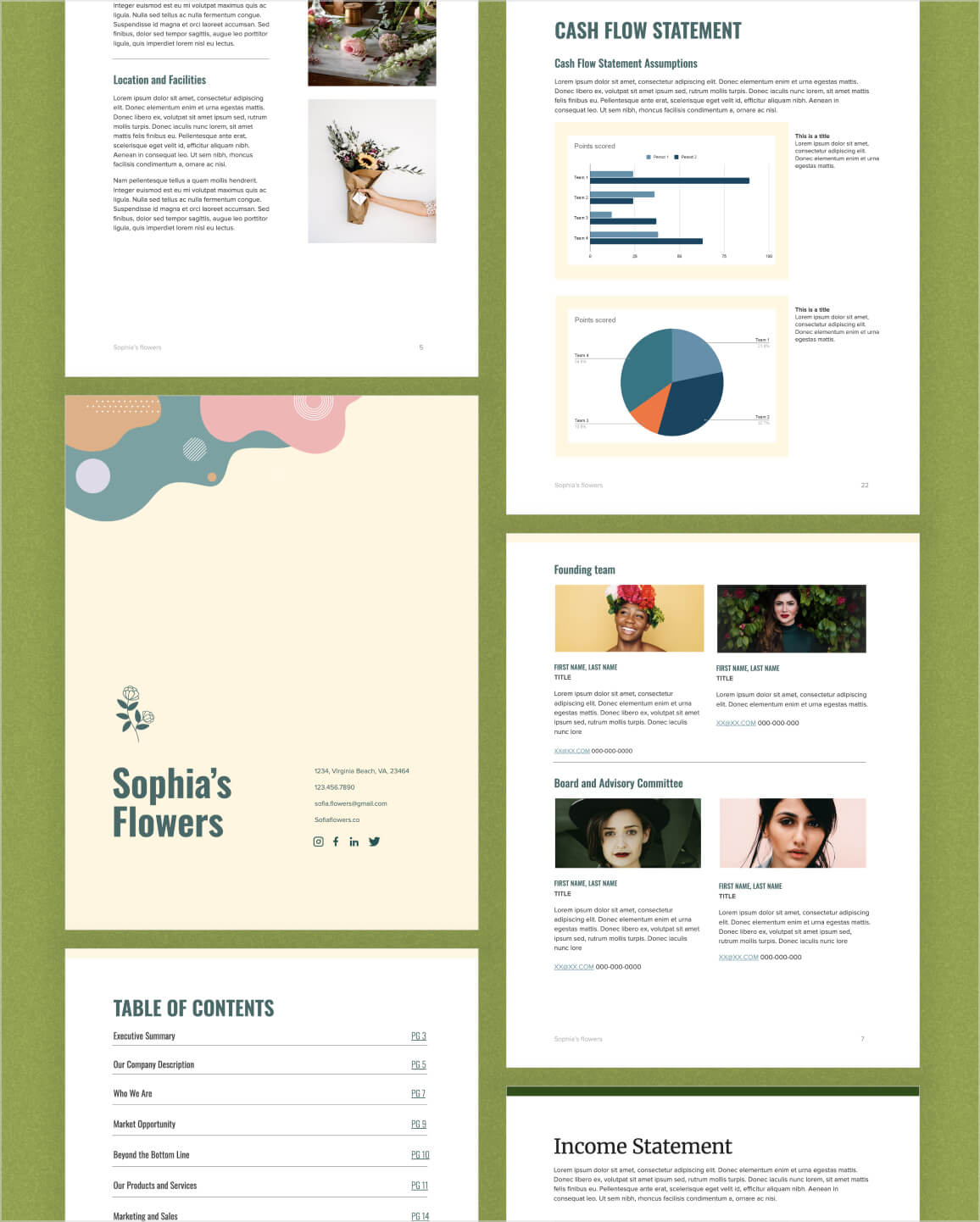 A comprehensive template for service businesses, sole proprietorships and founders seeking loans or grants, with dedicated sections for financials, operations, market opportunity, audience insight and social impact.